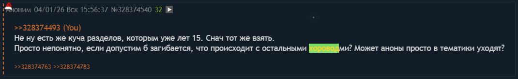>>328377137 >Я другое не понимаю - почему мелкохороводы не смогли переманить аудиторию по тематике? Хохлосрачи не все интересны. Нужна какая-то критическая масса. Отчасти смоги. Я наблюдая за некоторыми русскоязычными мелкохороводми: самые популярные сейчас на уровне постинга Того Самого 2007г. Но отчасти это потому, что сам формат умирает. То же и с Форчаном, етц.