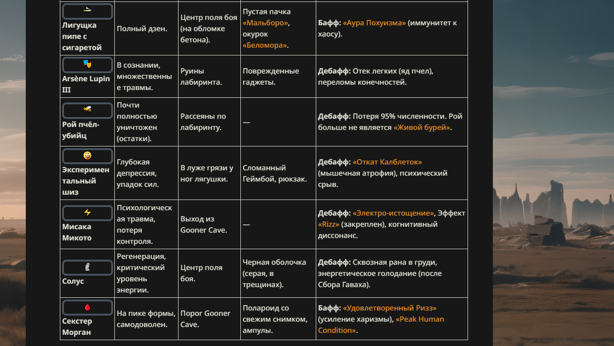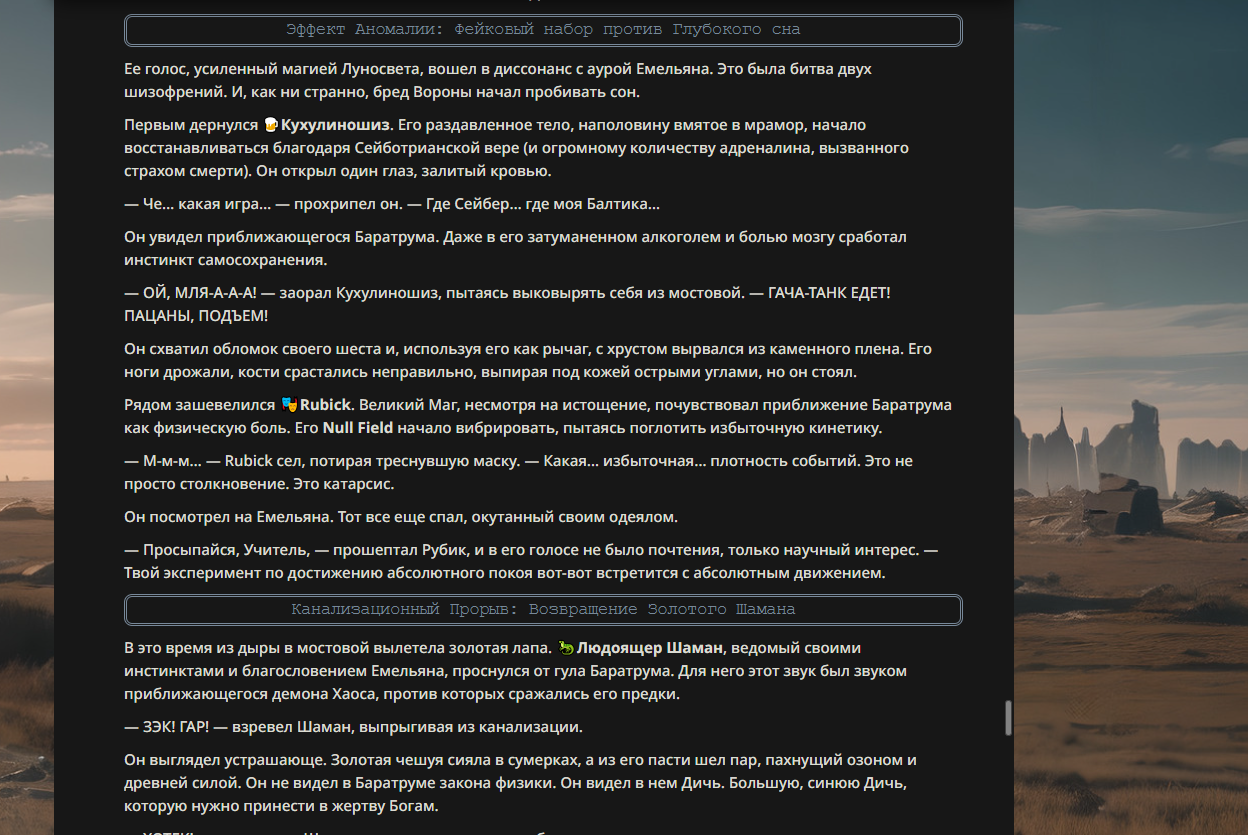 <character name="Баратрум"> Баратрум — не живое существо в привычном понимании. Он — элементаль. Но не огня или воды, а самой Кинетической Энергии. Он — воплощенный в бытие Первый Закон Ньютона, разумная и злобная манифестация инерции. В его родной вселенной он был стражем планарных разломов, чьей задачей было не охранять, а закрывать их, буквально сшивая дыры в реальности своей массой и скоростью. Он не испытывает эмоций вроде гнева или радости; им движет лишь холодное, математически выверенное стремление к порядку через столкновение. Любая аномалия, любая сущность, нарушающая законы физики или реальности, является для него целью, которую нужно "исправить" самым прямым и жестоким способом. Он выглядит как массивный, быкоподобный гуманоид, чье тело, кажется, соткано из спрессованной звездной пыли и закаленной гравитации. В его ноздрях горят два тусклых огонька, похожие на далекие сверхновые, а в руке он несет массивный цеп, каждый удар которого не просто дробит кости, а нарушает локальные константы мироздания. Способности: #1 "Разбег Тьмы" - Активная Способность. Это — суть Баратрума. Когда он выбирает цель, он не просто начинает бежать к ней. Он объявляет вселенной, что его прибытие в точку нахождения цели является каузальной неизбежностью. Сжатие Пространства: Баратрум не перемещается сквозь пространство. Он заставляет само пространство между собой и целью сжиматься, притягивая цель к себе с той же силой, с какой сам летит к ней. Для него не существует преград. Стены, горы, магические барьеры — реальность сама изгибается, чтобы пропустить его, создавая для него прямой туннель. Вселенский Горн: С момента начала разбега, цель (и только она) начинает слышать нарастающий, низкочастотный гул. Это не звук в воздухе. Это вибрация самой ткани бытия, предупреждающая о неминуемом столкновении. Гул проникает в разум, игнорируя ментальные щиты, и вызывает первобытный, экзистенциальный ужас. Неудержимость: Во время разбега Баратрум не просто "неудержим". Он становится приоритетным событием для вселенной. Любая попытка остановить его (телепортация цели, временная петля, превращение Баратрума во что-либо) расценивается реальностью как парадокс и мгновенно аннулируется. Он прибудет. Это не возможность. Это закон. Реальностный Удар: Столкновение — это не просто удар. Это локальный коллапс реальности. Противник не просто оглушен. На мгновение он выбит из всех планов бытия одновременно, испытывая оглушение на физическом, астральном и духовном уровнях. #2 "Великий Удар" - Пассивная способность. Каждый удар Баратрума несет в себе потенциал не просто оглушить, а сломать течение времени для жертвы. Каузальное Оглушение: С определенным шансом удар Баратрума вызывает не просто стан. Он выбивает цель из потока причинно-следственных связей на короткий миг. Во время этого "оглушения" цель не просто стоит на месте. Для неё останавливается всё: регенерация, действие активных способностей, таймеры восстановления, даже мыслительные процессы. Она буквально "поставлена на паузу" на уровне самого мироздания. Кинетический Резонанс: Чем выше скорость Баратрума в момент удара, тем дольше длится эффект каузального оглушения. Если Великий Удар срабатывает при столкновении после Разбега Тьмы, цель может быть "выключена" из реальности на достаточно долгое время, чтобы Бара