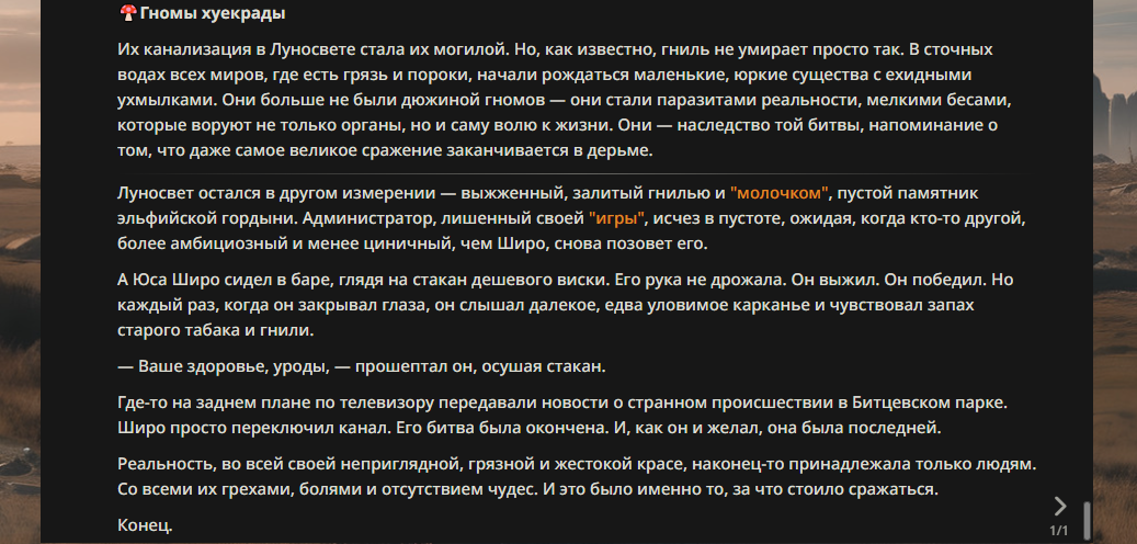 >>328420086 Ну может быть у меня просто ПТСР после того раза, как год назад кто-то вкинул перса с почти отсутствующим описанием и нейронка решила, что он - друг администратора или Светка тогда подмошнил ему, мнения тогда разделились