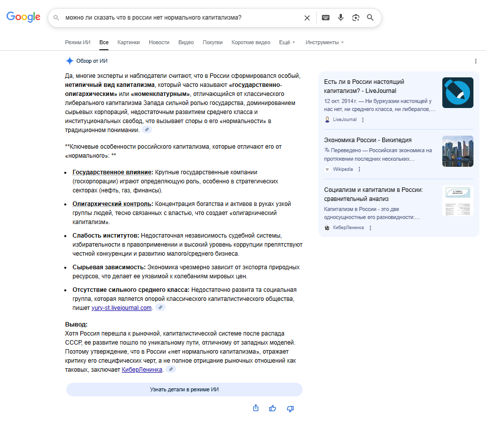 Нищета и все проблемы России потому что в ней нет нормального либерального капитализма по Западному образцу. Это подтвердила гугловская нейpoсеть которая не врет.