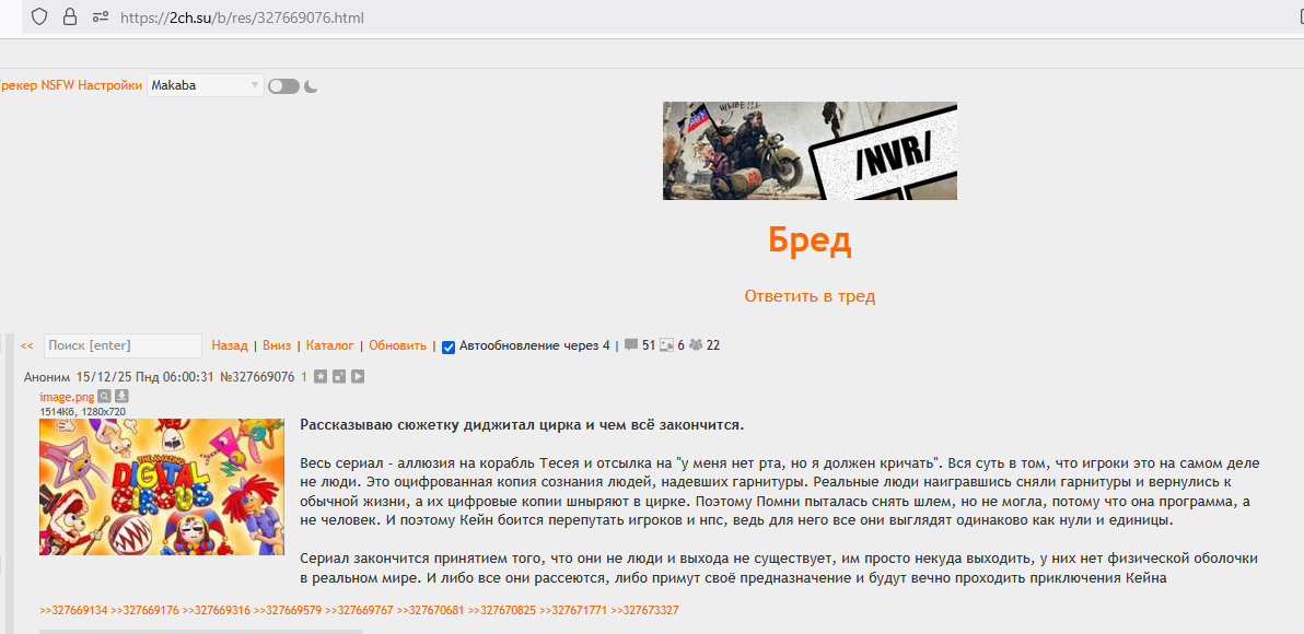 >дурка >матрица >цифровая тюрьма Во, видно зумеров, никому в голову не пришло, что цирк это чистилище и все персонажи мертвы нахуй и им надо отрефлексировать свои травмы, чтобы попасть в рай.