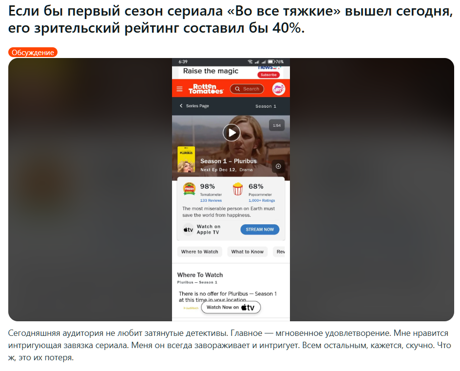>>3456854 >это так же бы смотрелось Тут все так как есть из-за того что у Винса такой стиль повествования, когда весь сезон это одна серия считай с плавными медленными переходами, а не как в других сериалах где новая серия новый конфликт.
