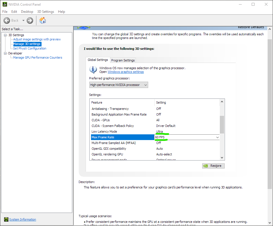 >>7643072 Второй способ - через драйвер нвидиа, в настройках опция max frame rate, и похоже что в дополнение нужно включать low latency mode - ultra, такой способ тоже работает но вроде как способ через утилиту rtss получше работает