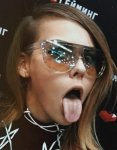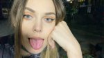 The girl in the photo opens her mouth wide and sticks out her tongue. Then the camera zooms in on her face, in close-up. Then she closes her mouth and kisses the camera lens.