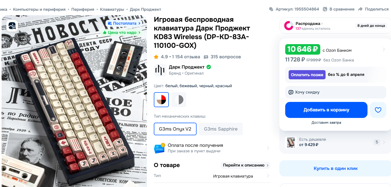 >>7630109 Я кепки либо через алик либо через Казахстан вожу почти откуда угодно. На озоне брал только Kailh BOX Jade 90 штук. Не знаю, зачем они мне, но цена там была какая-то мучительно смехотворная на скидке. 1200р кажется.