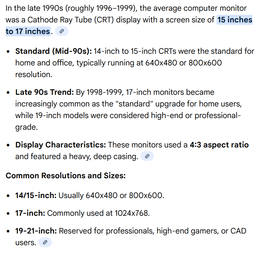 Средний размер моника в конце 90х был 15, в начале-середине нулевых 17 дюймов. Это золотая эра компьютерных игр. Именно под такой размер мониторов и создавались всякие фаллауты, морровинды, готики, варкрафты, и прочие думы и халф-лайфы.