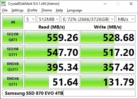 >>7609804 Если ты выйграл силиконовую лотерею и диск попался нормальный то где то 700мб\с. Если ты неудачник и купил худший вариант начинки - то может проседать до 20мб\с.