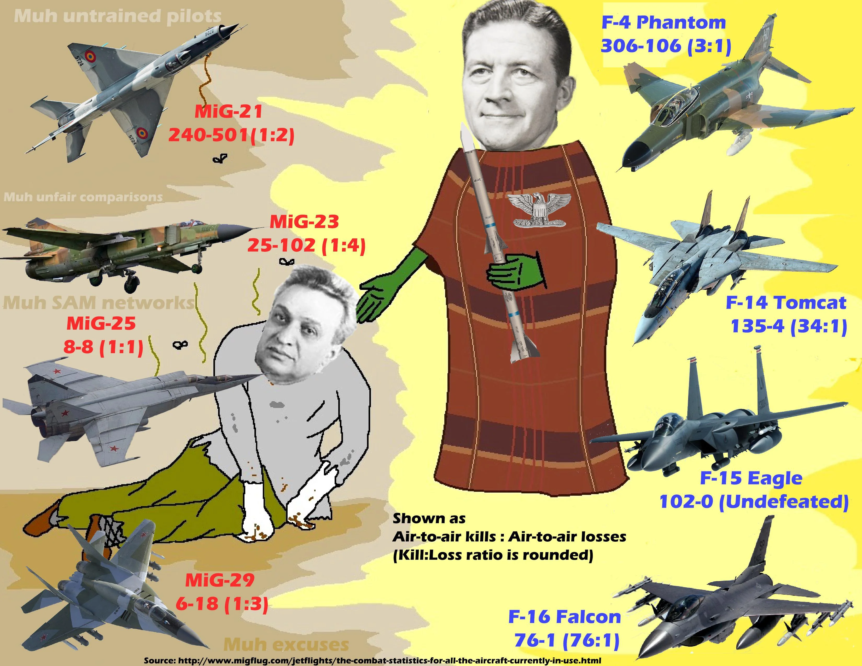 >>8466912 Там статистика чумовая еще со времен Кореи. Сначала нарисовали Сейбру 10:1, потом осетра урезали в два раза, потом еще урезали и стало более правдоподобно. Видимо под влиянием советских данных. В остальных случаях никто ничего не пересматривал, так и пересказывают про 100:1 на голубом глазу, а возразить как-то и некому, победителей не судят