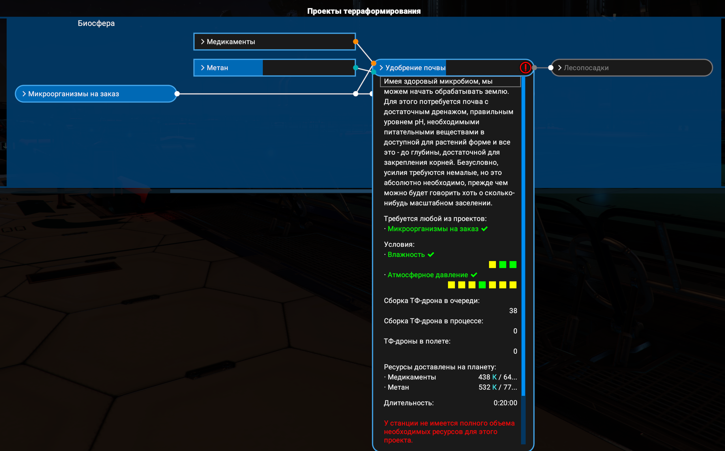 Про то что у разрабов кончились идеи как растянуть геймплей можно понять по терраформированию. Короче, ты просто собираешь ресурсы, а потом выкидываешь их. Типа, всё. Кстати, не понимаю зачем для удобрения почвы медикаменты, можно было бы просто начать СВО.