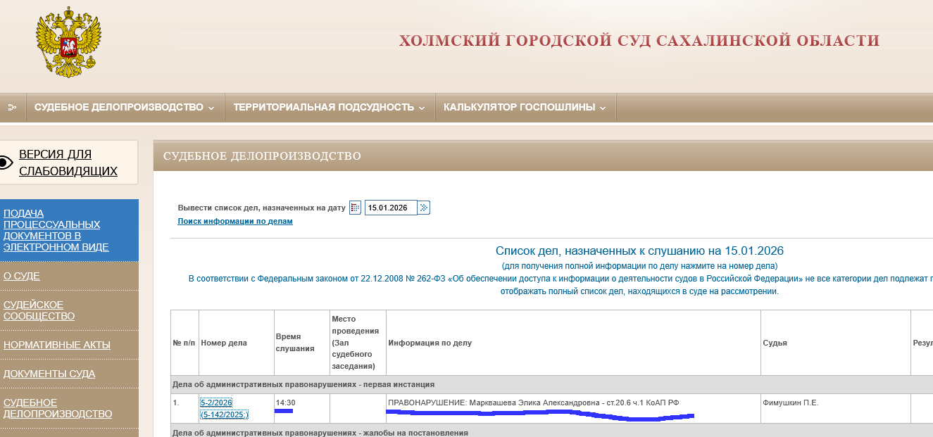 The court session will take place January 15, 2:30 p.m. Kholmsky city court Kholmsk, Sovetskaya St., 13