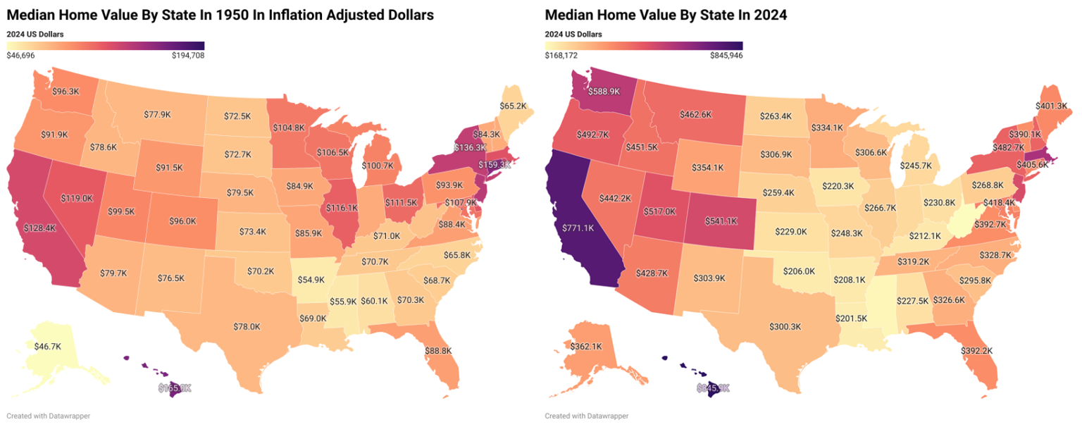 >>61663743 (OP) Так-то раньше в США вполне себе можно было прикупить недвижимость поработав несколько лет. На пикче цены в 1950 и сейчас с поправкой на инфляцию. Средний класс вполне хорошо себя чувствовал. Плюс была господдержка по ипотекам, плюс, что самое главное, инвестиционные фонды не были заинтересованы в скупке жилья.
