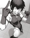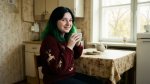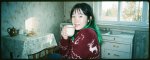 One asian teenage girl. She got pale freckled skin, brown eyes, round facial structure, small nose, full lips, thin eyebrows, smooth complexion, freckles, slightly crooked teeth, slim cheeks. And black hair with green tips. The girl is dressed in a warm, knitted dark red sweater adorned with reindeer. She sits on a stool in the small kitchen and drink tea. She sits half-turned to the camera.