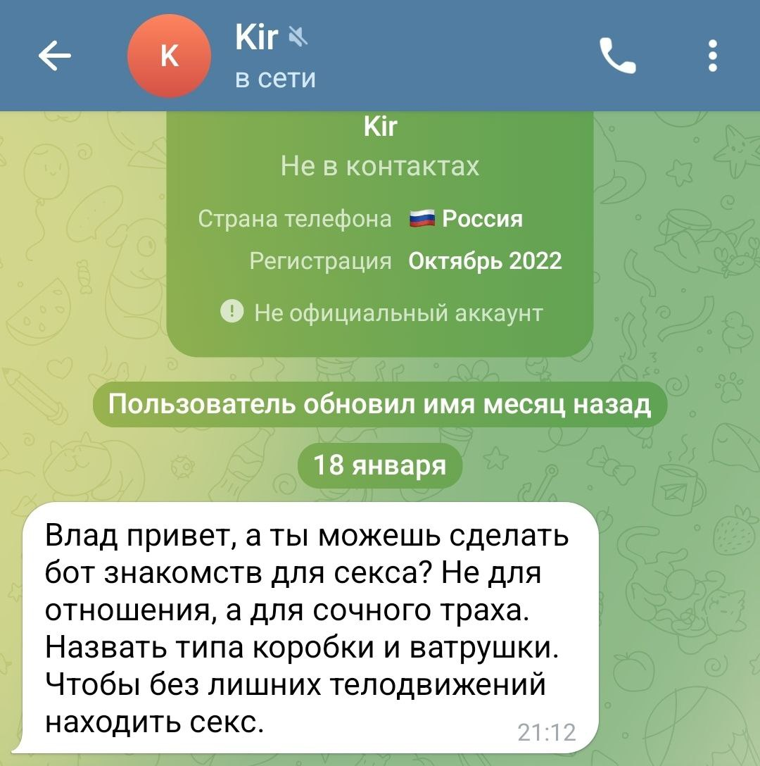 Как вы не поймёте, что у девушек нет такой животной потребности в сексе как у вас. Поэтому в таком боте будете сидеть только вы и трахать друг друга в жопы. Ни одна девка туда не вступит.