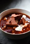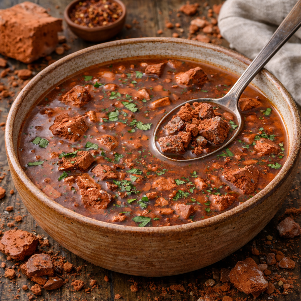 Состав: Бульон овощной - 1 л Морковь - 2 шт. (кубик) Сельдерей - 2 стебля (ломтик) Лук репчатый - 1 шт. (мелко) Кирпич терракотовый - 100 г (крошка 2-4 мм, прокалить) Зелень петрушки - для подачи Соль, перец - по вкусу