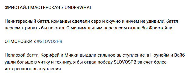 Нищета никак не могла начать командник из за того что у них супер тихо звучал бит в ушах при этом в зале бит хуярил бассбустом, нафталанджи ебался рил полчаса. Потом перед каким то раундом риф флипанул типа «дада они такие ща охуенно грозные, при этом не могли сейчас начать раунд полчаса но Чейни это вырезал» Потом на судействе пох про это упомянул записав в минус, тип мэн че за манипуляция, и вообще пох супер жестка загасил типов. Кароч лично что батл действительно не однозначный, и конечно школьники будут адово гореть от судейства Вики на этом батле и как он в батле за 3 место назвал 11 хуевым и вообще лишним в командном раунде