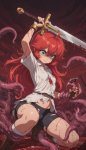 hell background, girl on red devil penis, cowgirl, extreme insertion, extreme sex, vaginal, sweat, stretched vagina,