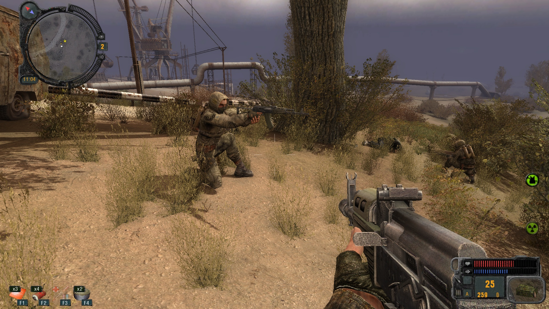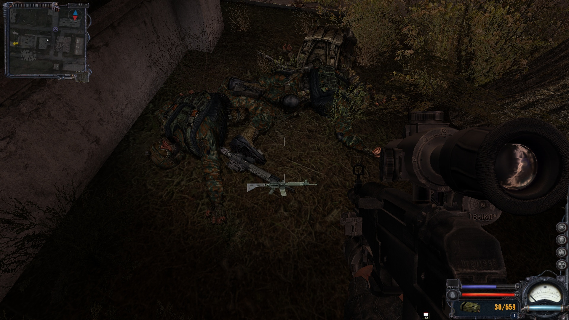 На свалке, идя по направлению к темной долине, наткнулся на интересную картину — отряд из двух бандитов типа остановился отдохнуть. Один вообще лёг подремать под разрушенные сооружения. Решил дать отдохнуть им по-человечески. Первого спящего успешно зарезал, а со вторым чуток обломался — промах, он успел мне по ебалу ударить, но сам ножом по ебалу таки успел получить. Двигаюсь отбирать ключ от лабы у Борова. Штурмом. Даже скорострельный калаш взял с собой. Чую будет мясо