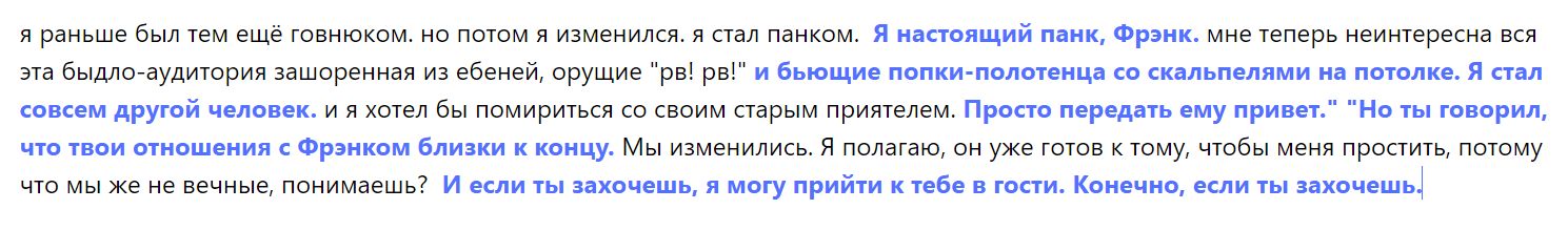 >>180612 >В баттлах корпоративные отношения. Это бизнес понимаешь, законы бизнеса везде одинаковы. Уж точно не в теме блоггинга и баттлов, потому что... Хотя, знаешь, наверное ты прав, участникам плейоффа не стоило оспаривать решения ресторатора, ведь уже сейчас видно, что сезон вышел замечательным, у версуса произошёл приток аудитории, куча спонсоров ломятся в дверь со своими предложениями, мы увидели кучу интереснейших баттлов, и я не могу дождаться финала, ведь там будет крутейшее противостояние мастодонтов баттл-рэпа -- палмдропова и райтрауна