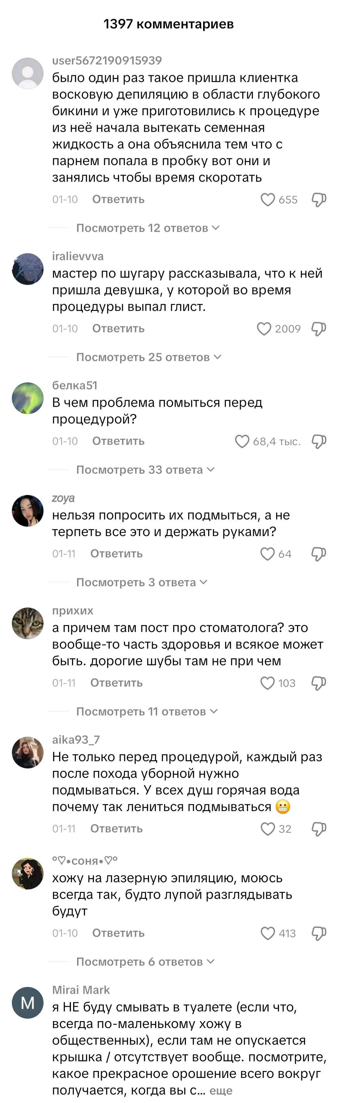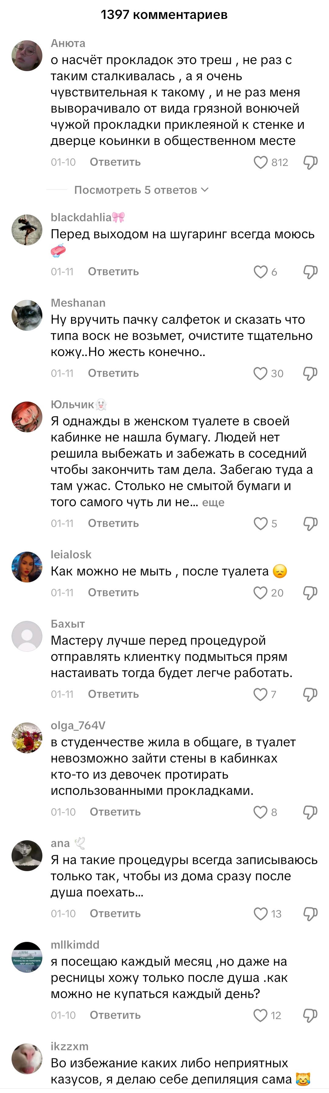 Я мужик и то я моюсь каждый день, после туалета обязательно, даже хуй вытираю после того как поссал. Мне трудно поверить, что многие тян такие как тут говорят. Это какой-то сюр. Они же всегда хорошо одеты, вкусно пахнут, маникюр, педикюр, а тут...