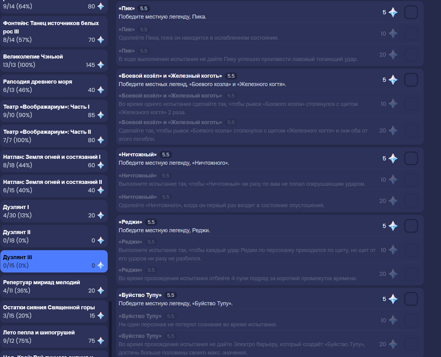Хм, а есть в генше фан-сайт аналогичный рельсовской туопе? То бишь, отсортированный наглядный каталог подтвержденных прохождений с ютуба-билибили. Очень полезная штука посмотреть, кто чем хорошо проходит, как быстро, с каким костом и так далее.