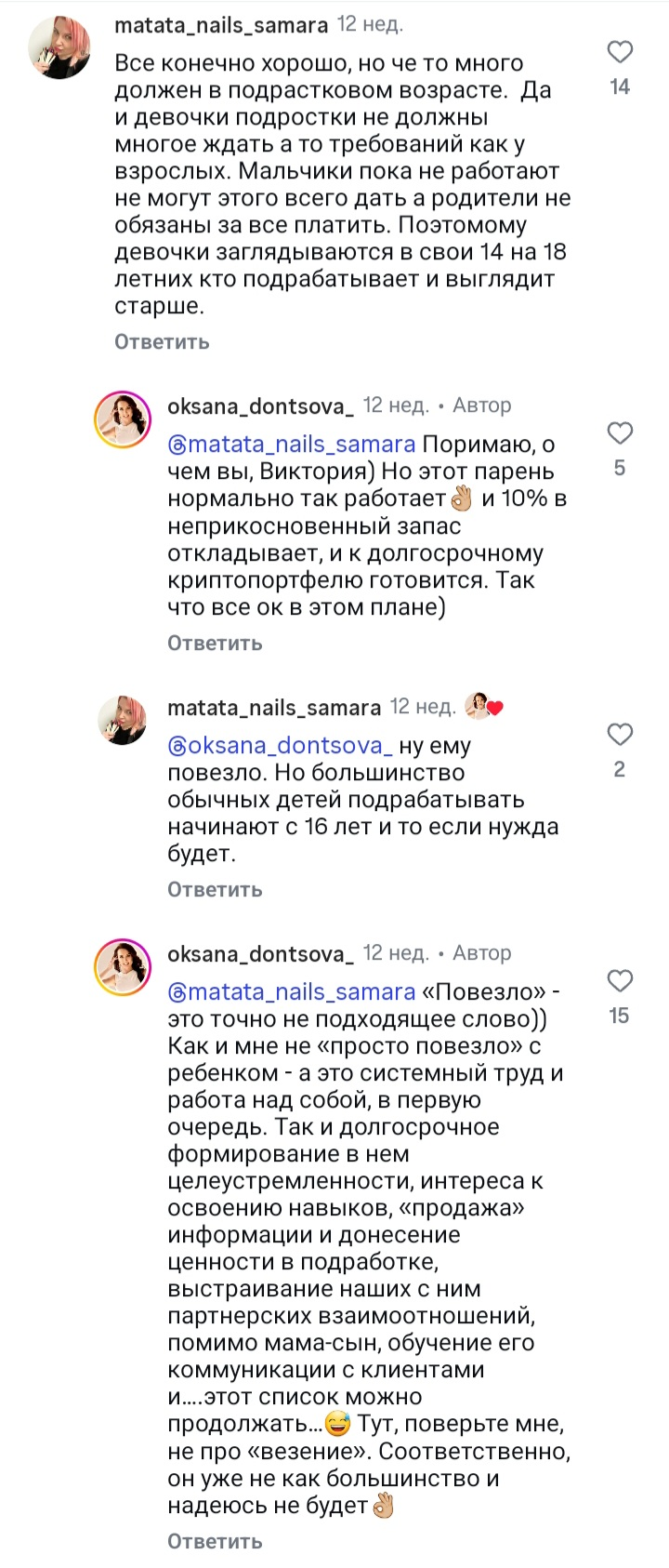 Ну, я же слушаю, что она говорит. Я так проанализировал, и сделал вывод, что мысли интересные. Но я не уверен, что итог ее воспитания будет хорошим. Так же, не уверен, что итог будет плохим.