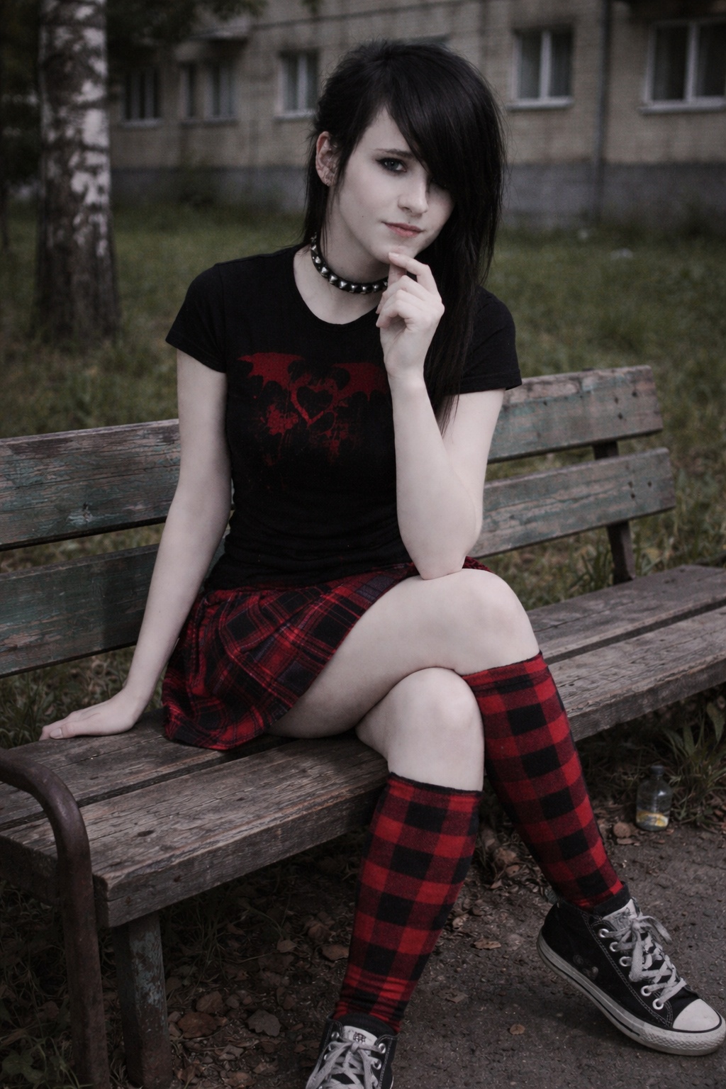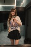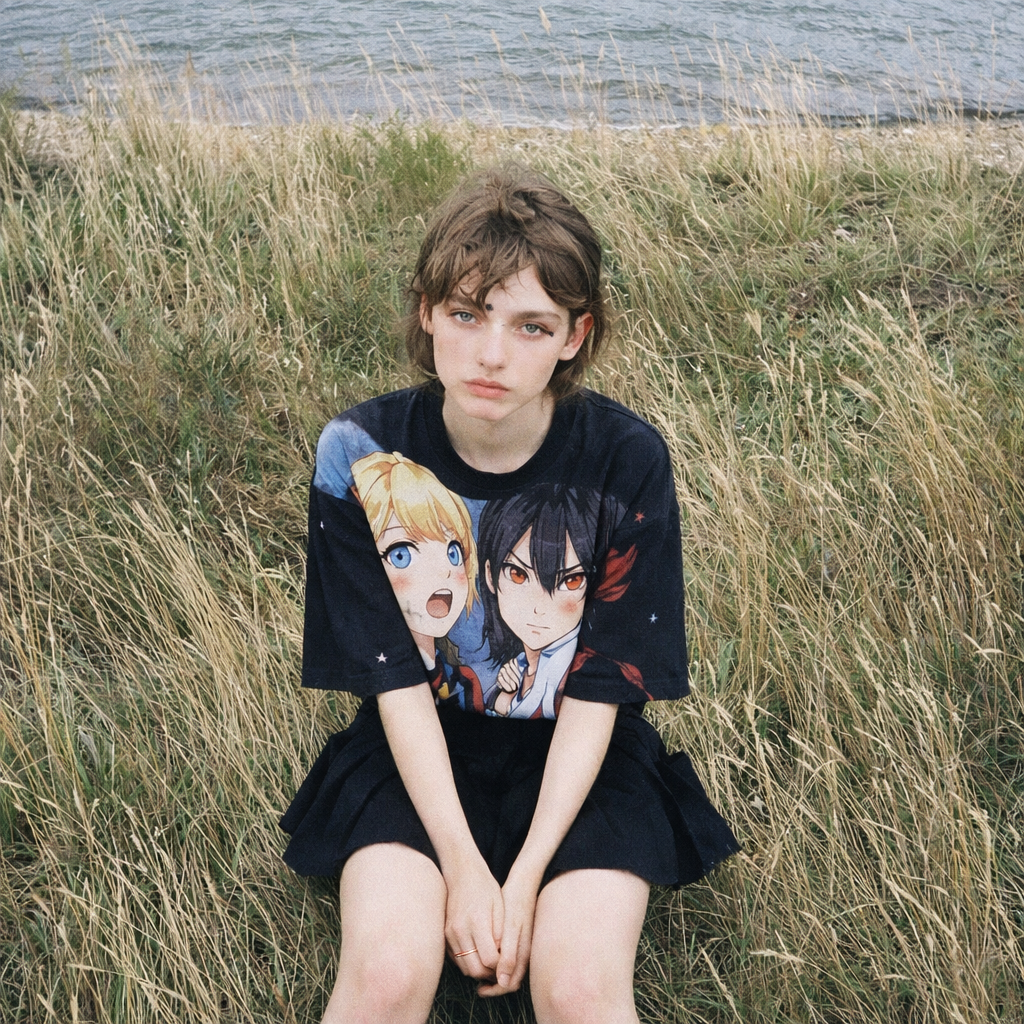 Естественная (живая) фотография на основе изображения-референса, где мужчина заменен на молодую, красивую, шикарную, стройную девушку миниатюрного телосложения. Она одета в объемную футболку (оверсайз) с ярким аниме-принтом в стиле манга и черную плиссированную мини-юбку, фото ф полный рост. Она сохраняет ту же позу и выражение лица, что и на оригинальной фотографии. Фон и освещение остаются без изменений. Реалистичная зернистость пленки, детализированные текстуры.
