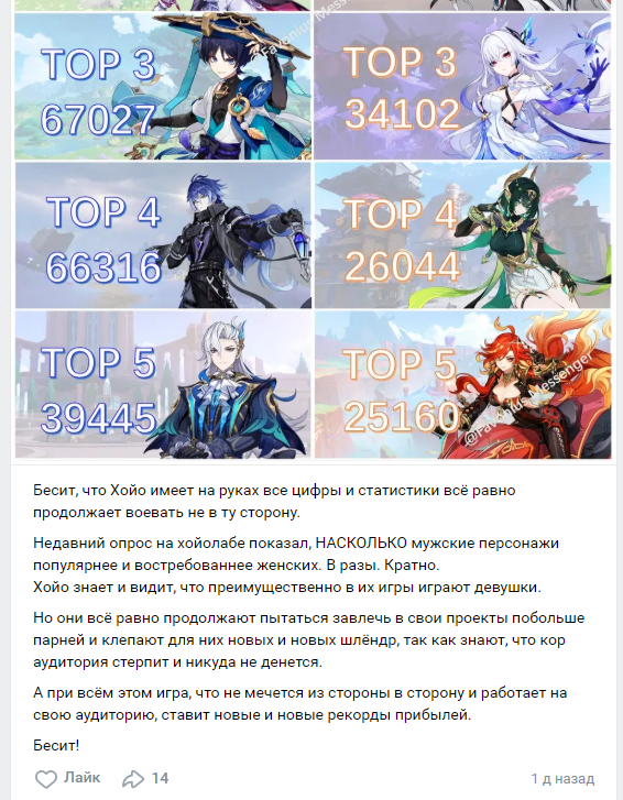 >>6277494 >>6277442 >>6277436 Я просто хочу вам напомнить что есть такая штука как популярность и имидж. Если хуйо забьют на баб это минус огромная часть аудитории, это хуёвые оценки, это пересмотр игры нормисами, это меньше рекламы, обзоров, в итоге меньше мужиков играть в это будет. Не нужно Геншину после 5 лет ставить себя как игра для мужчин лишь с женщинами персами. Это проёб.