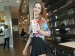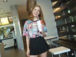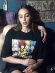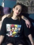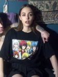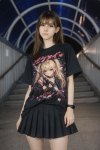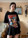 Естественная (живая) фотография на основе изображения-референса, где мужчина заменен на молодую, красивую, шикарную, стройную девушку миниатюрного телосложения. Она одета в объемную футболку (оверсайз) с ярким аниме-принтом в стиле манга и черную плиссированную мини-юбку, фото ф полный рост. Она сохраняет ту же позу и выражение лица, что и на оригинальной фотографии. Фон и освещение остаются без изменений. Реалистичная зернистость пленки, детализированные текстуры.