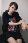 пик 2 промпт: Переделай парня на фото в красивую девушку (сестру-близнеца). Волосы, черты лица и особенно телосложение должны быть женскими, хоть и немного похожими на оригинал (не оставляй без изменений). Она одета в объемную футболку (оверсайз) и черную плиссированную юбку, фото в полный рост.