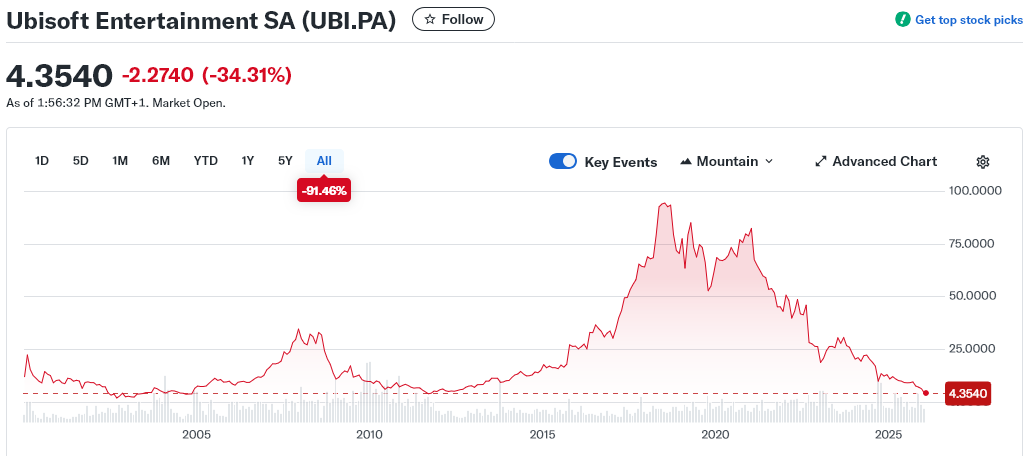 Ранее стратегическое партнерство и доля акций принадлежали внешним инвесторам, включая китайского гиганта Tencent – это значит, что значительная часть доходов от ключевых франшиз, таких как Assassin's Creed и Far Cry, могла уйти не на развитие компании, а на счета её партнеров. В связи с чередой коммерческих провалов игр, таких как Skull and Bones и Star Wars Outlaws, акции Ubisoft стали резко падать, потеряв почти 90% своей стоимости за пять лет. Руководство компании сначала почти ничего не делало, чтобы остановить падение, лишь констатировало проблемы. Даже появлялись слухи о том, что у Ubisoft просто нет средств и идей, чтобы избежать банкротства.