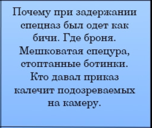 Моя версия, что синевики это Эшники, кстати как видим они без стволов, им дали задачу "бля мужки есть информация чёт гоовится идите посторожите" опять же вспоминаем стрельбу у здания ФСБ где чел час ходил с ружъём под окнами в центре Москвы и его не могли ликвидировать, потому что это р. здесь всё работает через жопу, взывать к логике бесполезно, тут дурдом полнейший и нихуя не работает.