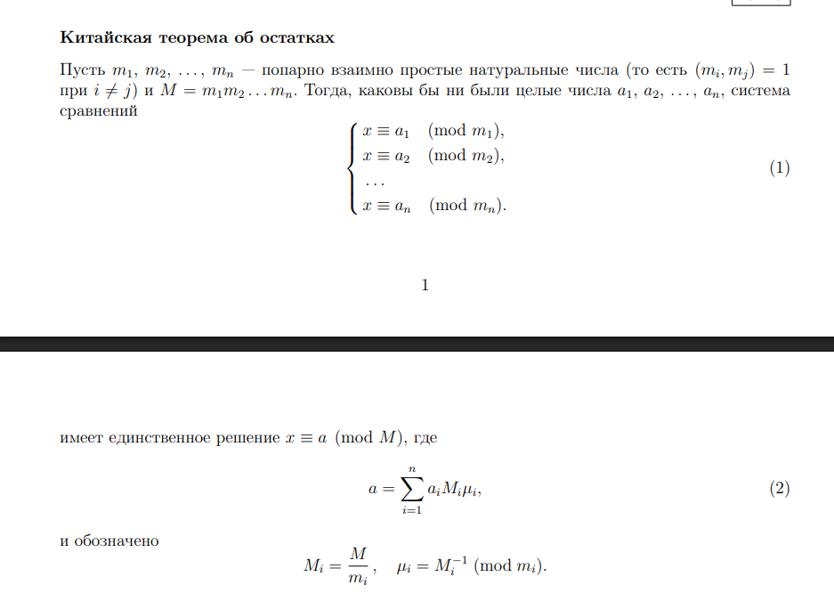 >>329156621 Потому к каждой формуле должно быть пояснение. К каждому переходу. Глоссарий(матюгальник) который расписывает что значит какая буква. В твоём скрине x это количество солдат a1 это количество оставшихся в стороне при построении по три. В моём примере a1=2 a2 это количество солдат оставшихся в стороне при построении по четыре. a3 колво солдат с краю при построении по пять. m1= 3] первый модуль(ака делитель), в нашем случае m1= 3 m2 второй модуль. m2= 4 m3 третий модель. m3= 5 М произведение делителей. Оно же максимальное количество солдат вычислимым таким образом. М= m1 m2 m3 = 3 4 5 = 60