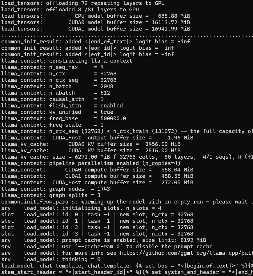>>1503319 >Попробуй взять квант поменьше, чтобы на 48гб с кэшем влезало. Llama-3_3-Nemotron-Super-49B-v1.Q6_K.gguf весит ровно 40 Гб, с хуя ли она не должна на 48 Гб с кэшем влезть?
