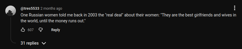 Рофл еще в том, что натаха там мычит что русские дамы - современные и независимые, поэтому их надо регулярно водить в дорогие рестораны и давать бабло на ништяки по щелчку, иначе она перескочит на другой хуй, тк независимая. Это они как плюс преподносят. Вдумайтесь блджад