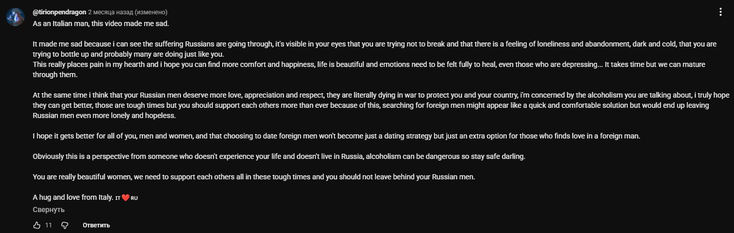 Понимаем лицемерие дырявых правильно, господа. Хотя я даже боюсь нырять в комменты на ютубе. Меня хватит кондратий если окажется, что кто-то из тамошних искренне поверил, что бабенция и правда считает, что все блять до единого мужики на сво.