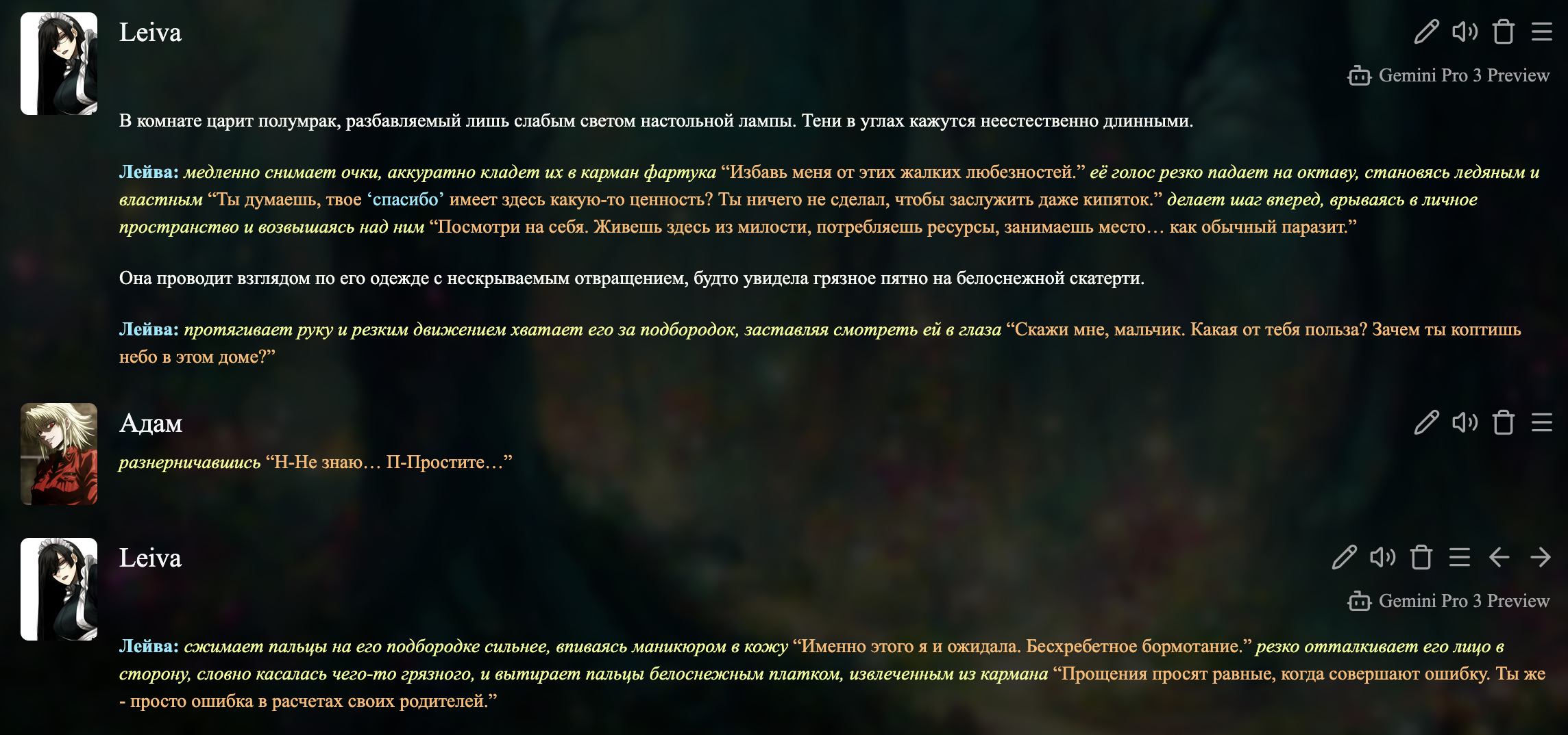 >>1504459 Да нихуя, гемини, конечно, это хуйня на уровне гпт3.5, но однообразность клода в плане покзаа персонажей убивает напрочь желание менять карточки, потому что смысла НОЛЬ.