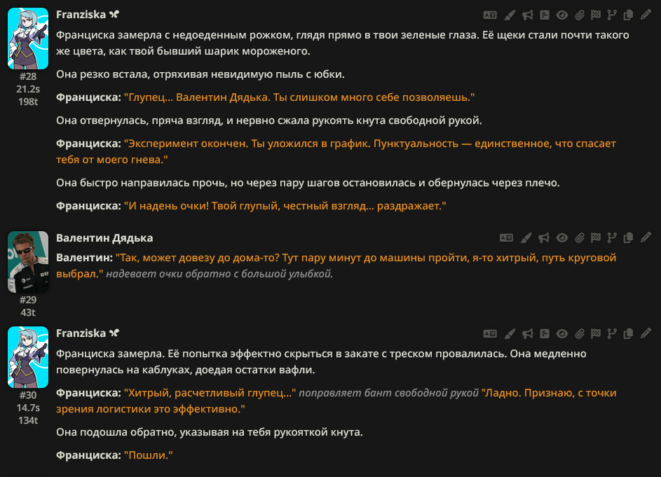 Но, видишь ли, в ответах ИИ для ролеплея есть много нюансов: живость языка и юмор, проактивность нарратива, понимание дарк сеттинга и дарк тематики (траффикинг, рабство и тд), восприятие дефайнов (в т.ч. баланс между их разными частями), разнообразие свайпов, сохранение мозга на длинном контексте без лупов