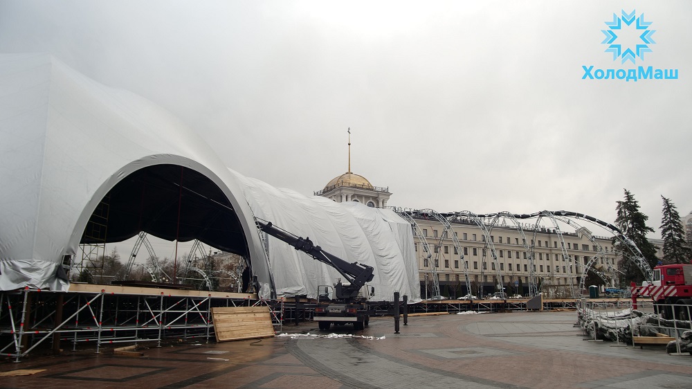 >Последующие этапы выполняли специалисты компании «ХолодМаш»: >- на ровное основание уложили двухслойную бакелизированную фанеру; >- возвели шатер; >- создали и залили ледовое поле площадью 1 400 кв. м; >- создали внутренние коммуникации; >- создали пункт проката.