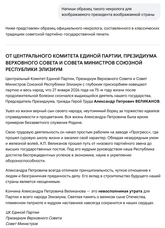 Нет больше великой личности — Владимира Путина, навек утрачены его уникальные сила воли, предвидение, способность руководить. Вероятность появления среди нынешнего населения Земли фигуры, обладающей такими же качествами, способной повести человечество к такому же блестящему будущему, составляет менее 0,000112 % (методика расчёта слишком сложна, чтобы приводить её в рамках данного некролога).