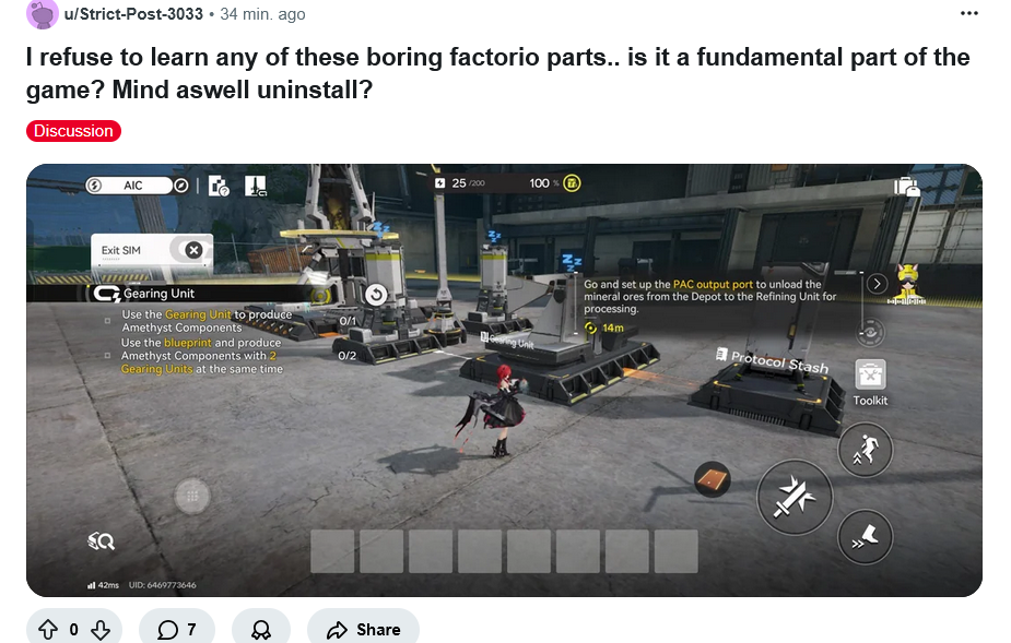 ⏳ 3. Игра жадна до времени В отличие от других гач, где дейлики занимают 10–15 минут, здесь: ежедневный обход 10 перерабатывающих станций, ежедневный фарм редких ресурсов, плюс стандартная трата энергии. Всё это растягивает рутину.