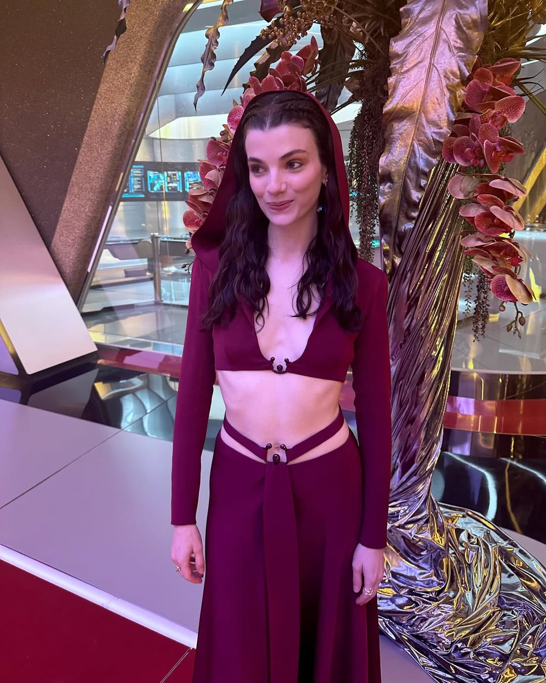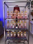 Лицо точь в точь. Она без одежды.Позади нее аниме плакаты. Рамка из аниме стикеров. исключительно женщина на фоне флуоресцентных оранжевых барби кукол на леске в виде квадрата 3 x 3 спереди. камера снимает через эту шторку из кукол. Из отверстия в картонной стене рядом с ее головой торчит член, она сжимает его губами. оранжевое освещение