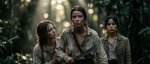 Adventure movie scene. Shallow depth of field. dark color palette, film grain, volumetric lighting. long telephoto lens, bokeh blur, close-up on faces. Low angle view. Year 1821, somewhere in Amazonia. Three female explorers are making their way through the jungle, towards the camera, all sweaty, tired, exhausted, dirty. In the foreground, the leader of the expedition, Anya Taylor-Joy, wielding machete and cutting her way through the lush vegetation, determined look on her face, gritting her teeth, spark in her eyes. Next to her, on the left, is a whiny weakling Emma Myers, dragging herself along, looking at Anya and complaining. On the right, slightly in background, is Jenna Ortega, with cuts on her face, stoically overcoming obstacles, glancing at Emma judgmentally. 21:9
