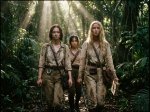 Внезапный шедевр без референсов, только текст: соотношение сторон изображение 4:3, фото на камеру, обьектив 60мм, джунгли, солнце пробивается сквозь деревья сверху вниз, в одежде исследователей 19 века, эмма маерс, аня тейлор джой, дженна ортега, грязные, вспотевшие, уставшие, несут инструменты исследователей джунглей 19 века, идут двое рядом, ортега чуть позади, мдут прямо на камеру и смотрят в камеру, вокруг свет в темноте пробивается свысока сквозь густые заросли джунглей