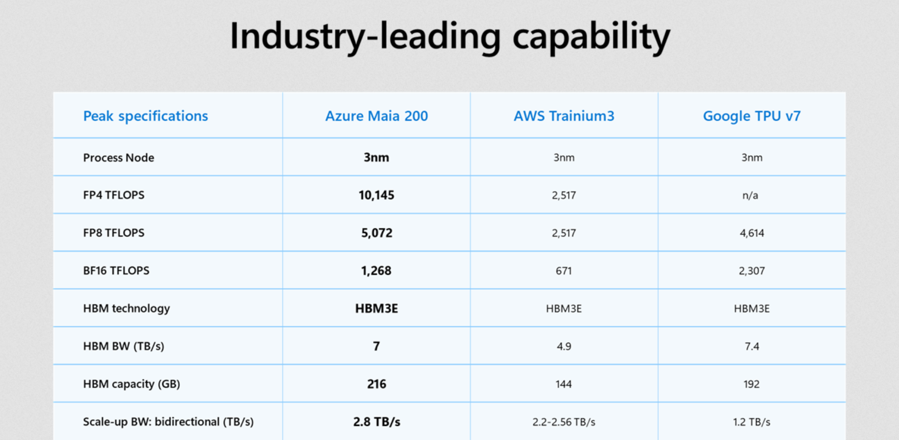 Maia 200 является "самой эффективной системой для инференса" из когда-либо развернутых Microsoft. Новый чип построен на базе 3-нм техпроцесса и содержит 140 миллиардов транзисторов. Он способен достигать производительности до 10 петафлопс в вычислениях FP4, что в три раза выше показателей конкурирующего чипа Trainium3 от Amazon. Maia 200 также оснащен 216 ГБ памяти HBM3e с пропускной способностью 7 ТБ/с, дополненной 272 МБ встроенной SRAM-памяти (на кристалле).