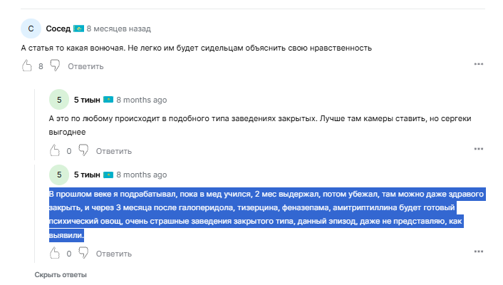 Вот правильные мысли, а то бабы из соц. сетей её хотят запрятать в психушку только по своей прихоти. Нельзя направо и налево всех "странных" прятать в психушку. Потому что условно обычный человек будет чувствовать свое превосходство над тем, кто состоит на учёте и пользоваться этим в корыстных целях - мол оболгать о агрессии, звонок в психушку и сразу заберут приедут.