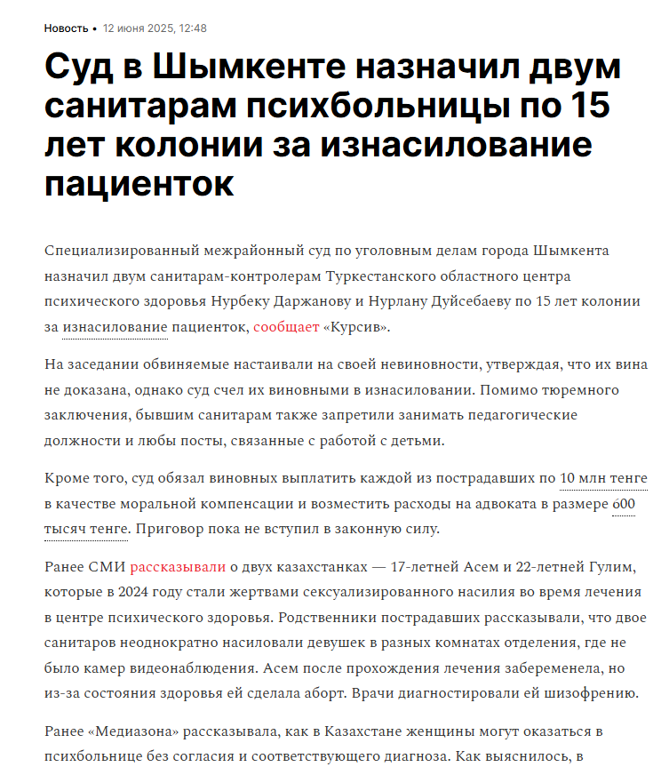 «Сегодня был суд. вы говорили ранее что она стоит на учёте, но сегодня когда судья спросил у неё, она отрицала и полиция это подтвердила! и тут говорите что принудительно положите её в психиатрическую больницу., но в конце сказали что её сперва ПРОВЕРЯТ, потом только если они ПОДТВЕРДЯТ её положат. зачем вы людей обманываете? люди, это ужасно несправедливо. моя жизнь стоит 85тысяч тенге? ей выписали только штраф за то, что она материлась в общественном месте. ЧТО ПРОСТИТЕ???? в суде она начала клеветать, говоря что я сама первая начала., а когда вышли, её мама спрашивает„чё такая недовольная? главное не убла же“. это слова адекватного человека? хуже то, что полиция даже никак не реагирует на её слова, обвинения, а когда я сказала „не убла же? то есть вы не понимаете всю серьезность ситуации?“ полиция сказала успокоиться», — написала семейчанка в соцсетях и записала эмоциональное видеообращение (орфография и пунктуация автора сохранены). https://m.vk.com/wall-29213922_715997