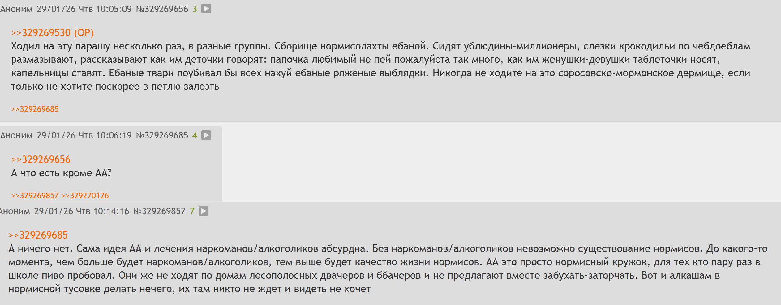 >>329269685 А ничего нет. Сама идея АА и лечения наркоманов/алкоголиков абсурдна. Без наркоманов/алкоголиков невозможно существование нормисов. До какого-то момента, чем больше будет наркоманов/алкоголиков, тем выше будет качество жизни нормисов. АА это просто нормисный кружок, для тех кто пару раз в школе пиво пробовал. Они же не ходят по домам лесополосных двачеров и ббачеров и не предлагают вместе забухать-заторчать. Вот и алкашам в нормисной тусовке делать нечего, их там никто не ждет и видеть не хочет