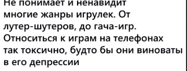 топлю байтотред базой >игры это пиздато когда ты просто в них играешь когда угодно (но без конфликтов с ирл обязательствами если таковые есть) и вообще потребляешь только то, что нравится лично тебе и подходит твоим предпочтениям (которые можно сформировать имея широкий кругозор, вот многие реально думают мол гача игры и фифа - кал по дефолту но они тупо повторяют за двачем и протыком по привычке не понимая что у разных людей разные вкусы и ритмика жизни, да и вообще одна вещь воспринимается по разному в зависимости от человека) >нужно просто не быть ебаной жирной мразью которая на форумные войны тратит больше времени чем на игры, не можешь что-то позволить себе (новая игра/консоль/пк железка) или что-то не равится - закрываешь ебало и не воняешь, идем мимо по своим делам а не срем своим тупорылым ненужным мнением кароче просто не быть пикрилом, меня всегда эта картина смешит когда ты там во что-то себе играешь или новый сериал смотришь и где-то на реддитах и двачах в это время ебанутые что-то там обсуждают как бабки на скамейке которые делятся своим ахуенно важным и красноречивым "это кал"/"это для нормисов"/"это для быдла"/"это для казуалов"/"это для анимешников"/вставить нужное