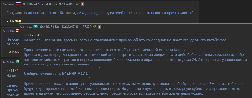 >>752563 >Есть ли какой-нибудь смысл в том что бы учить какой-нибудь другой вариант/диалект китайского Только если ты уже знаешь петуххуа. Потому что на нём больше материалов по диалектам. Ну и диалекты такое себе, в этих "диалектах", внутри есть свои диалекты. Учить строго если тебе нравится звучание, контента на них особо не если это не кантонский. Мне вот нравится хаккава 客家话. Он чуть похож на петуххуа только там не отвалились закрывающие согласные и не произошел сдвиг типа k - j, q Поэтому собака будет 犬 kʰian 日本犬 nidbunkhian 北京 bedgin считай как Пекин Прикольный диалект, с архаичным произношением. Но нахуй не нужен вообще.