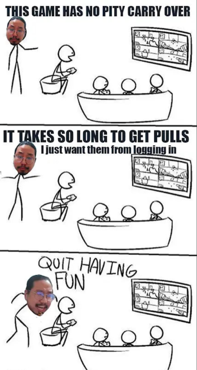 А вот тут отвечу. > А тебе будет хуже если эту скамную залупу уберут? Будет. Если убрать направленные на лудиков приколы, это всю систему гачи придется ребалансить так, что лудикам станет полегче, а обычным игрокам потяжелее.